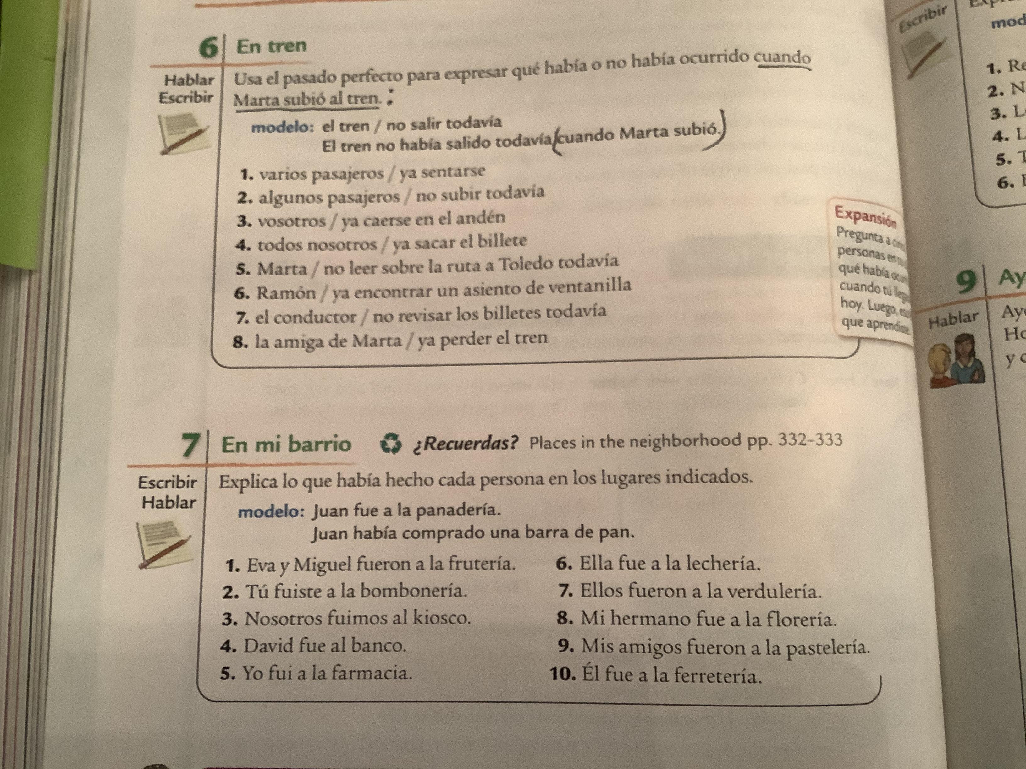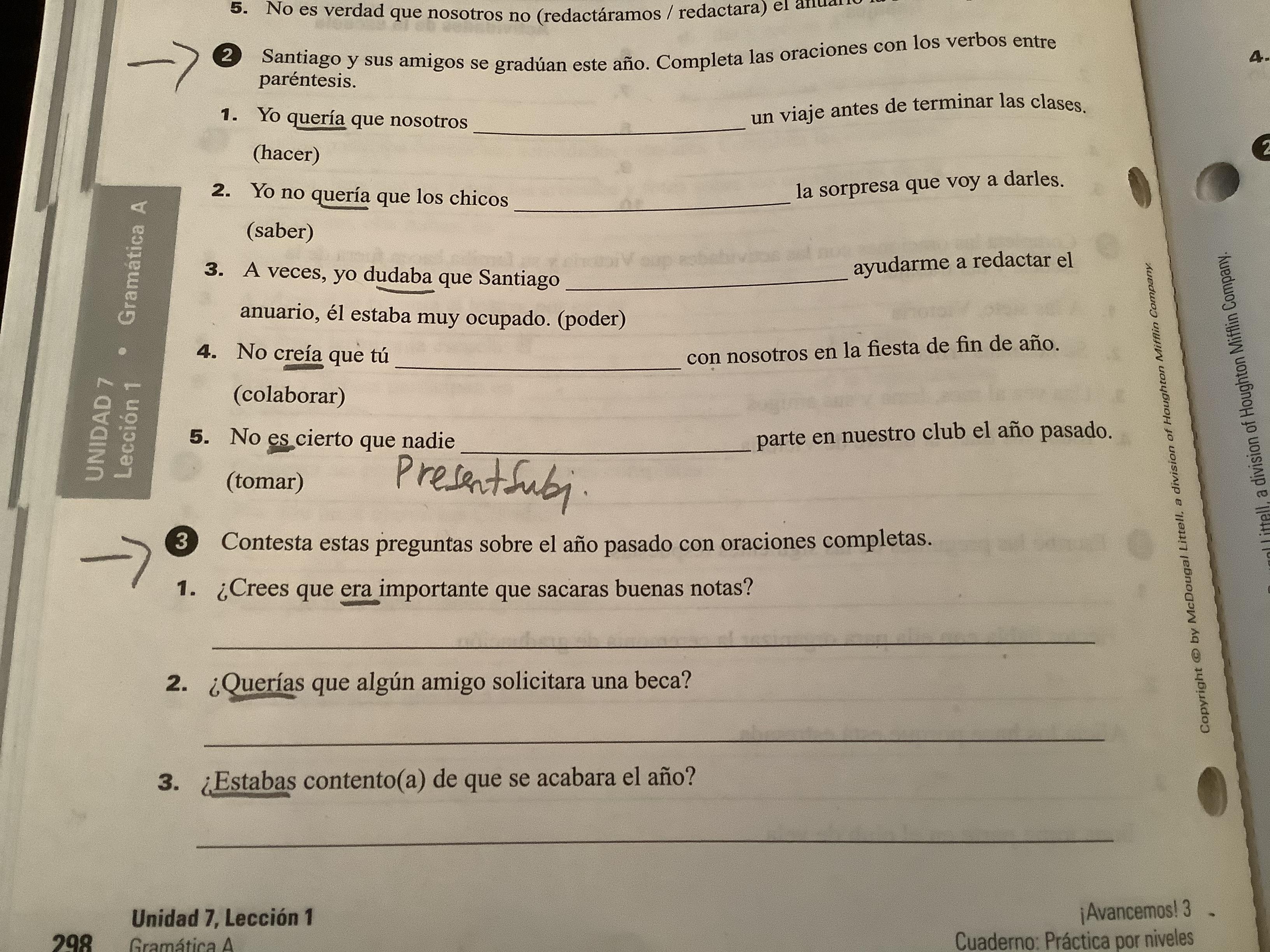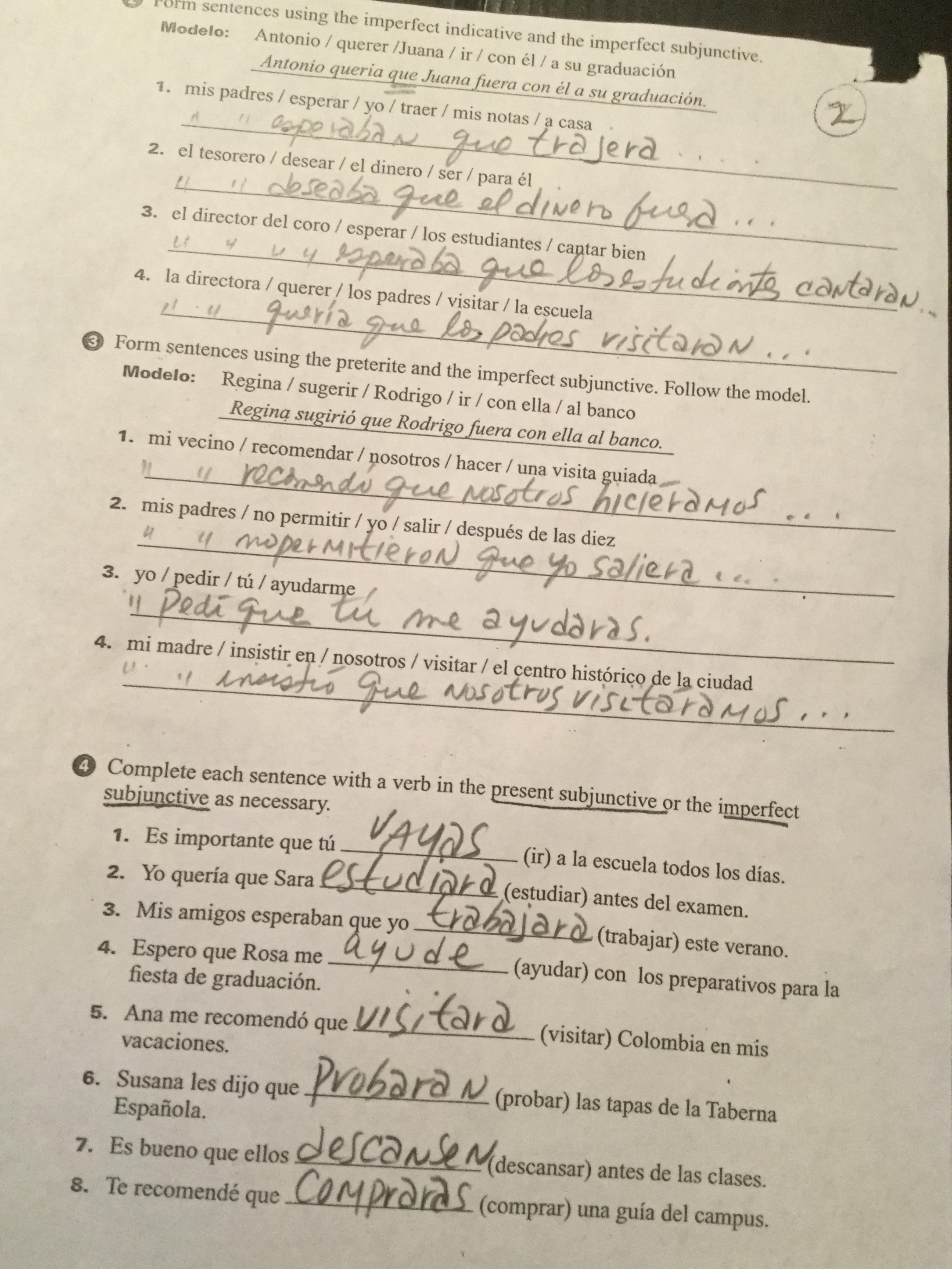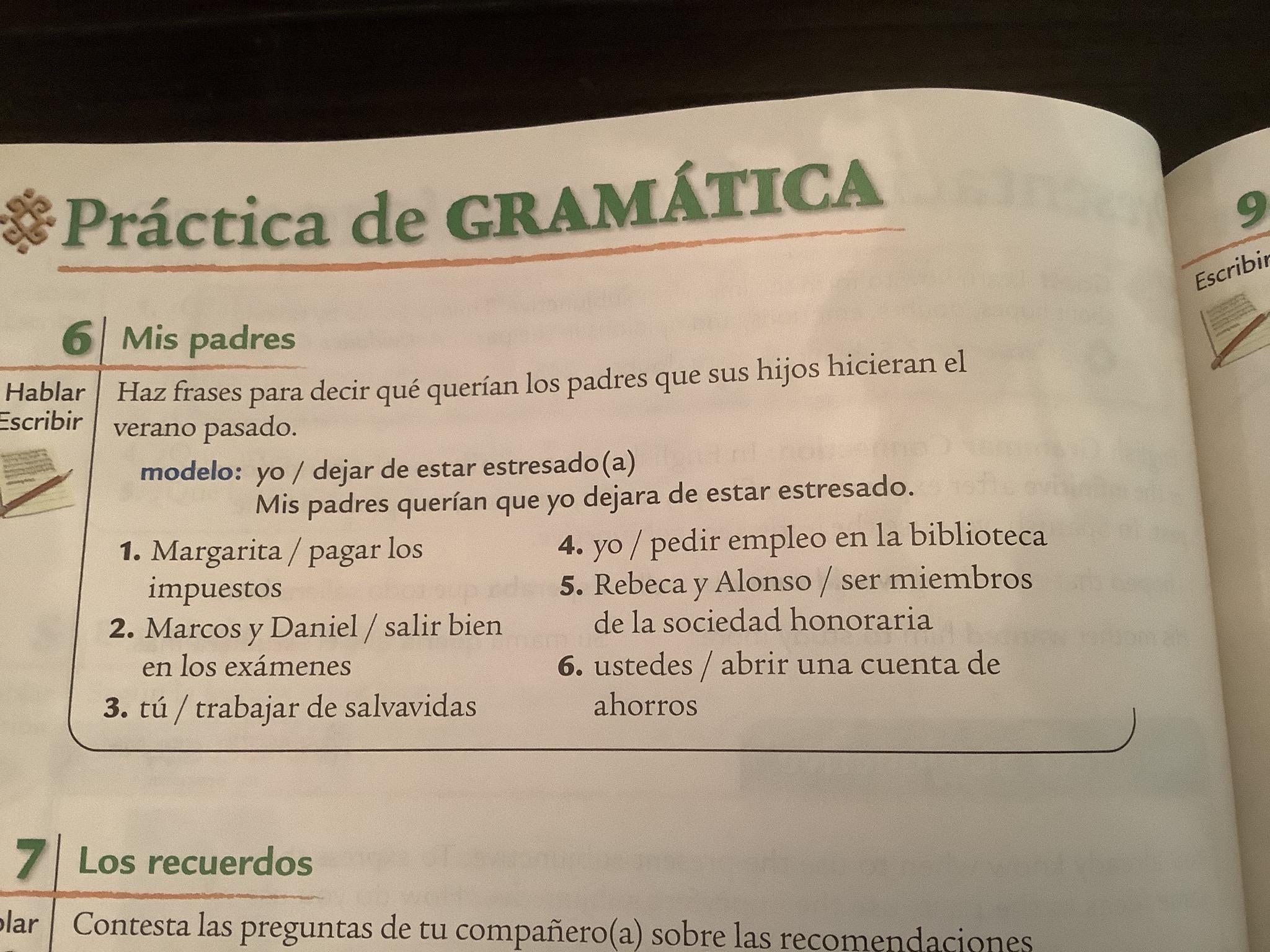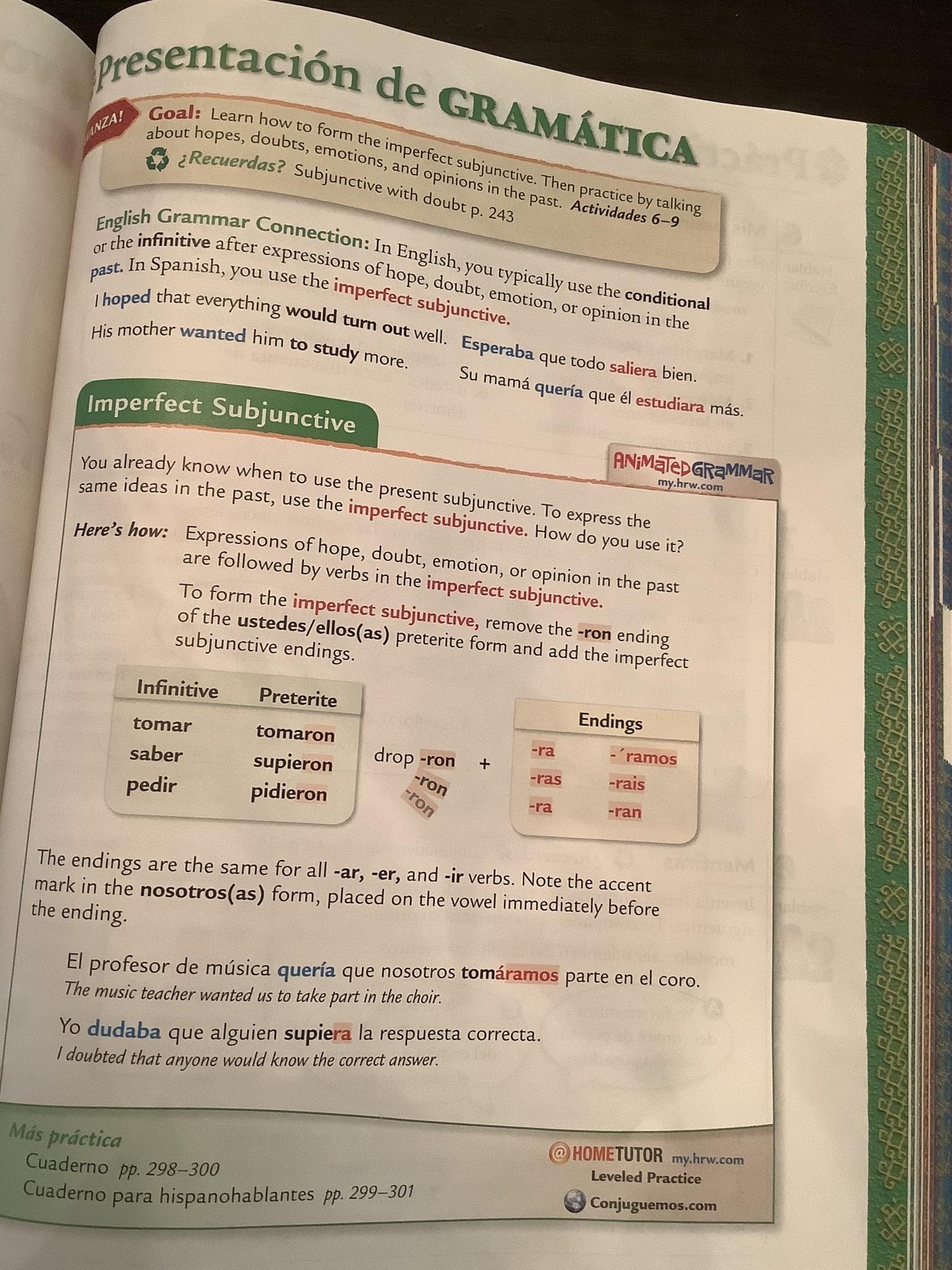 Please note that in Exercise 6 (398, text) and Exs. 2-3 (cuaderno) the practice is purely imperfect subjunctive, Which should be preceded by a first clause in the past indicative.