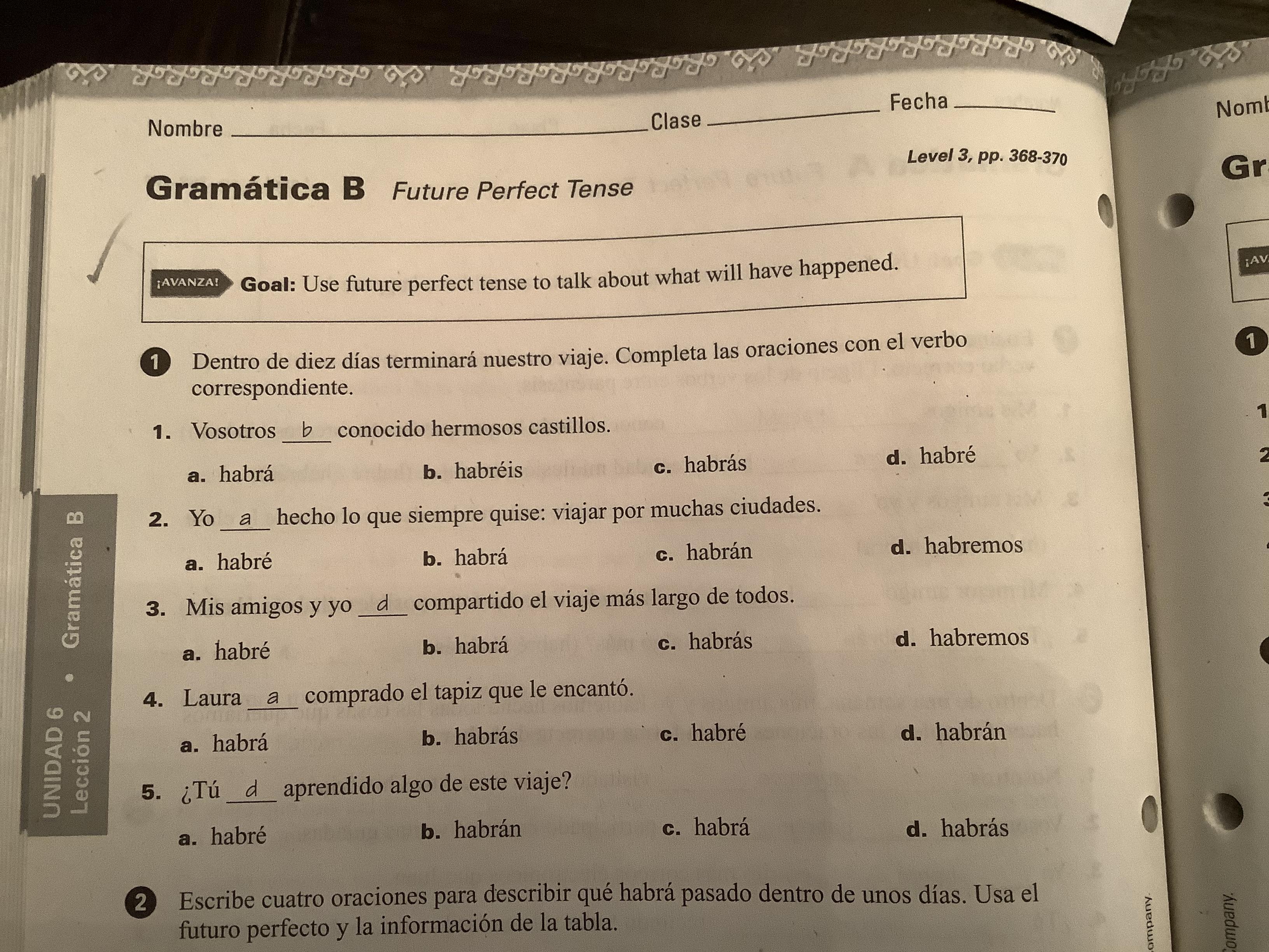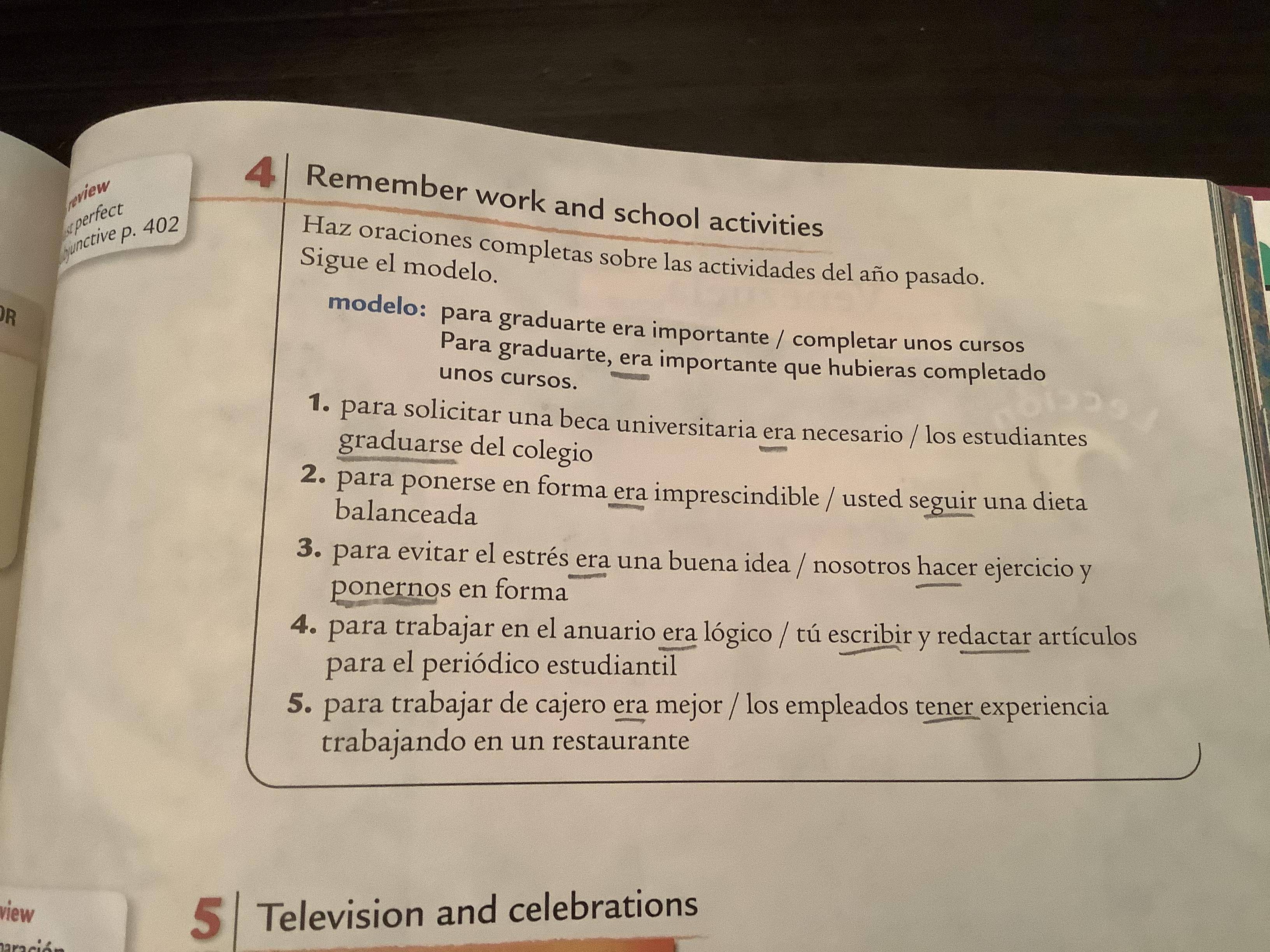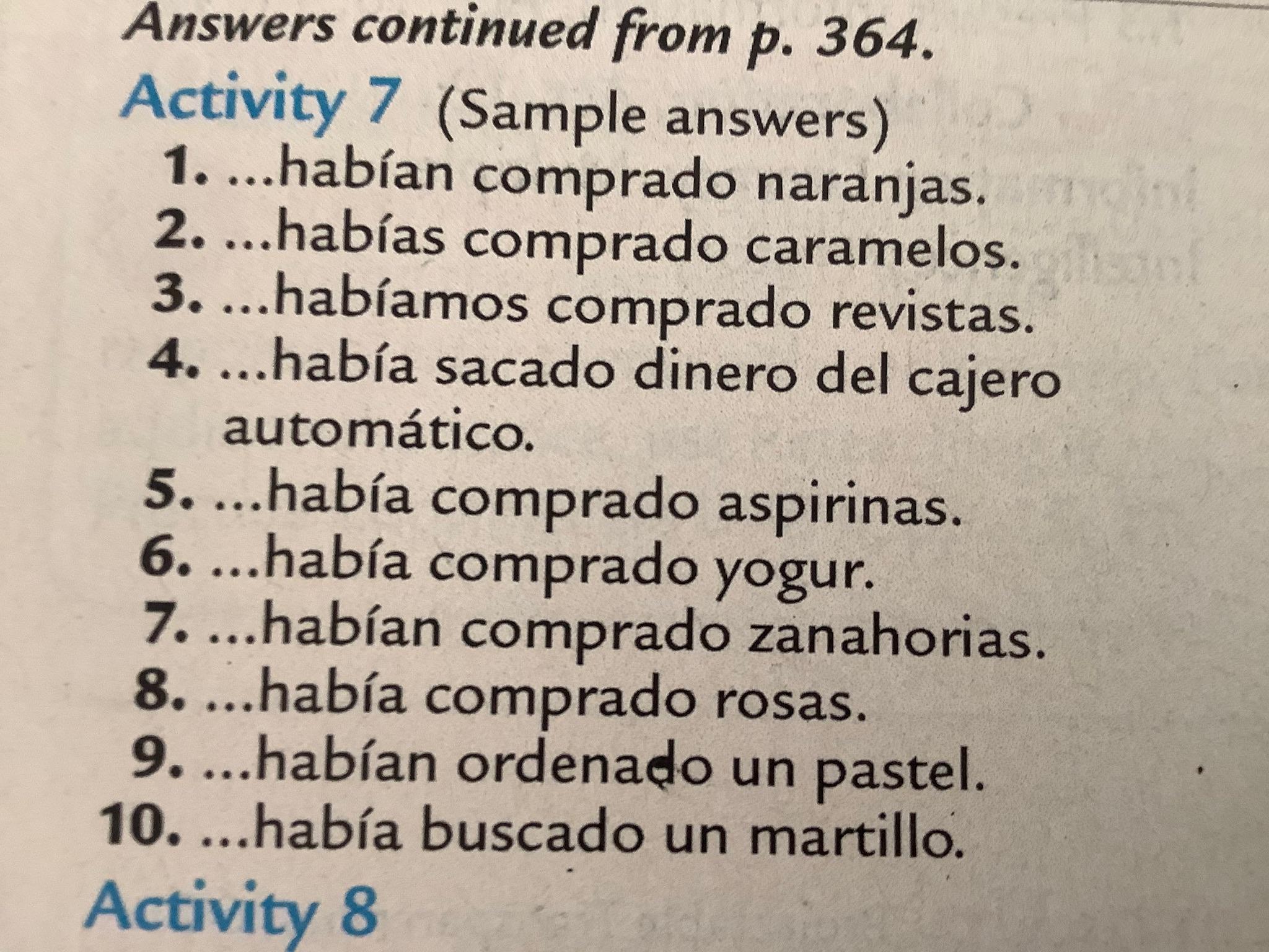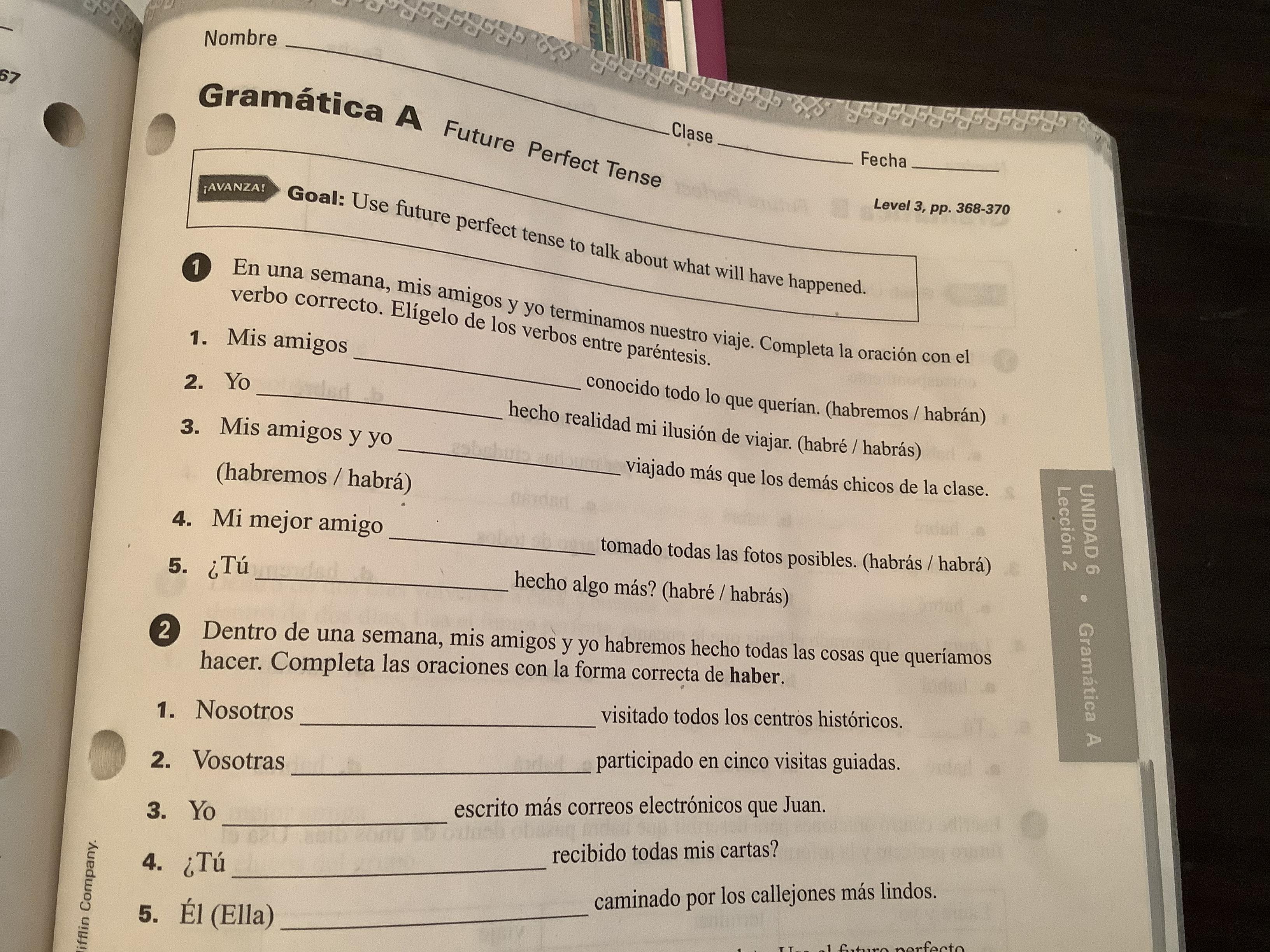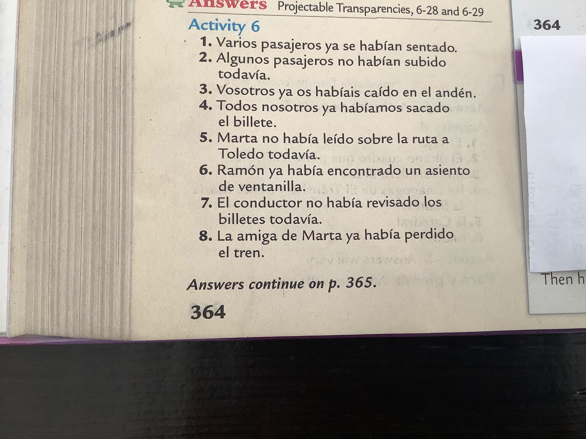 Please note that in Exercise 6 (398, text) and Exs. 2-3 (cuaderno) the practice is purely imperfect subjunctive, Which should be preceded by a first clause in the past indicative.