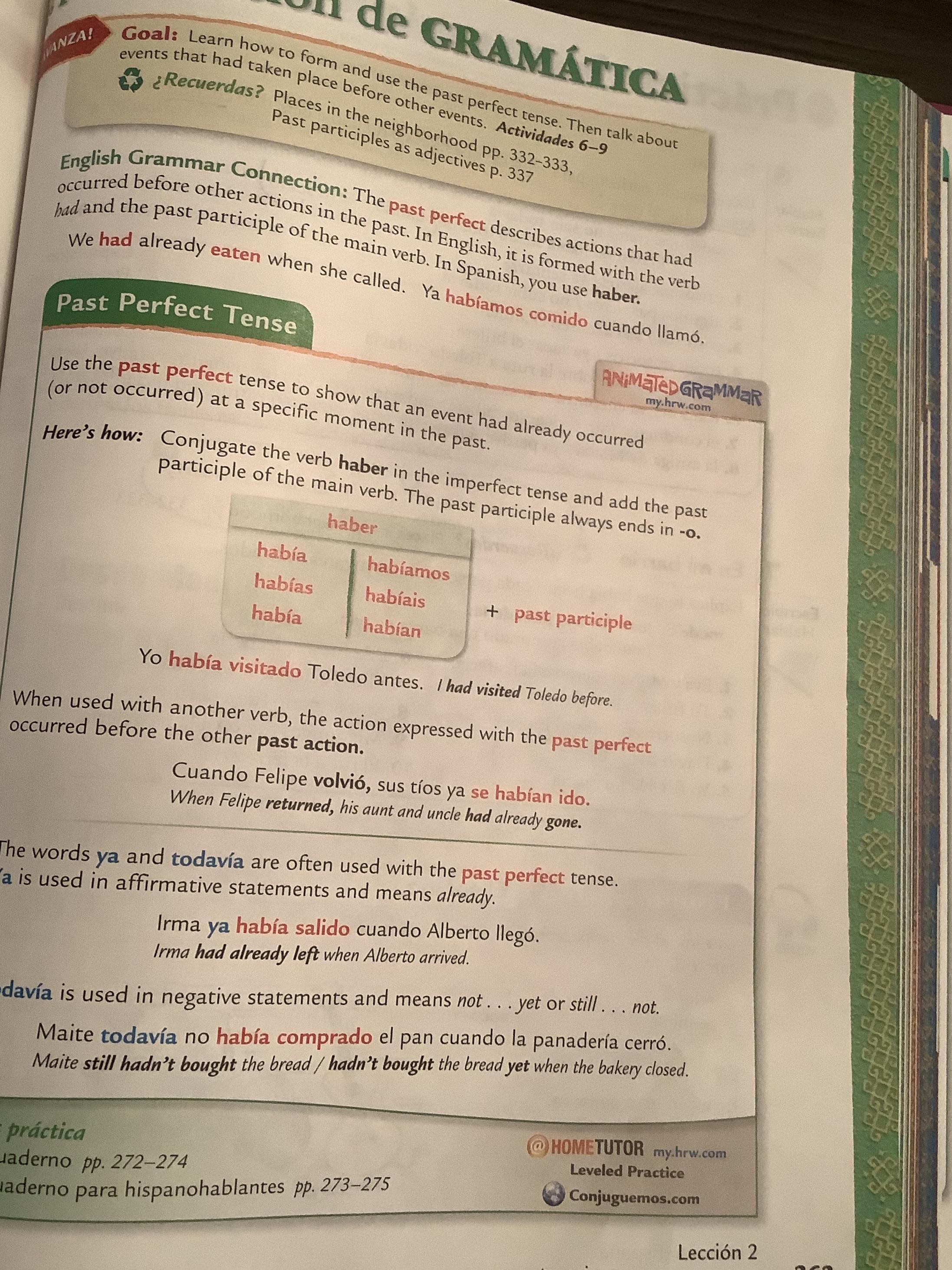 However, in Exercise 4 (415, text) the conjugation used is the Past perfect subjunctive that is formed with the imperfect subjunctive of Haber + past participle. For example: Era imposible que mi padre hubiera nacido antes que mi abuelo (it was imposible that my father had been born before my grandfather). If the verb in the first clause were in the present, then one must used the present perfect subjunctive, which is formed with the present subjunctive of the verb Haber + past participle. For example: Es imposible que mi padre haya nacido antes que mi abuelo (It’s impossible that my father have born before my grandfather.