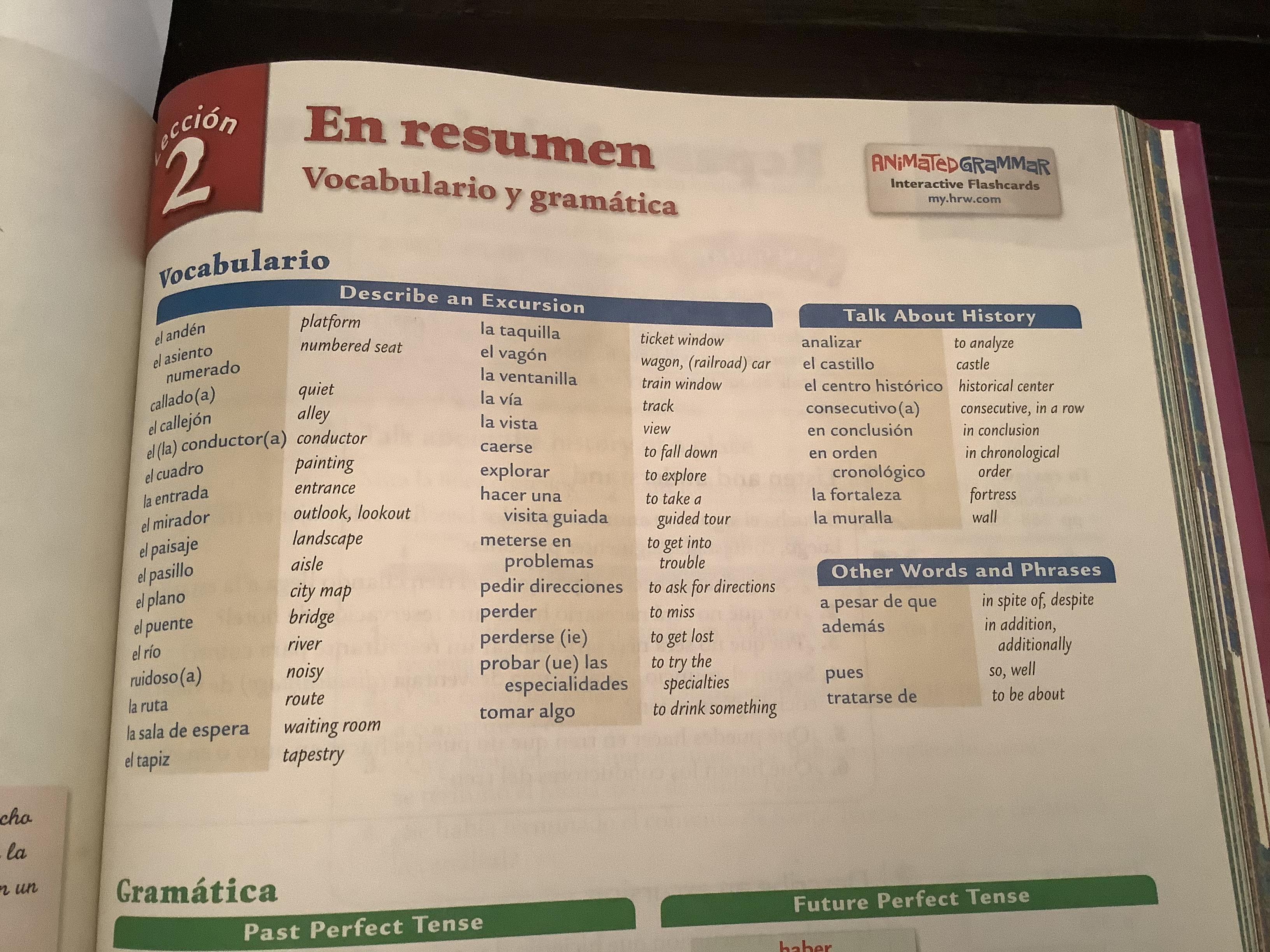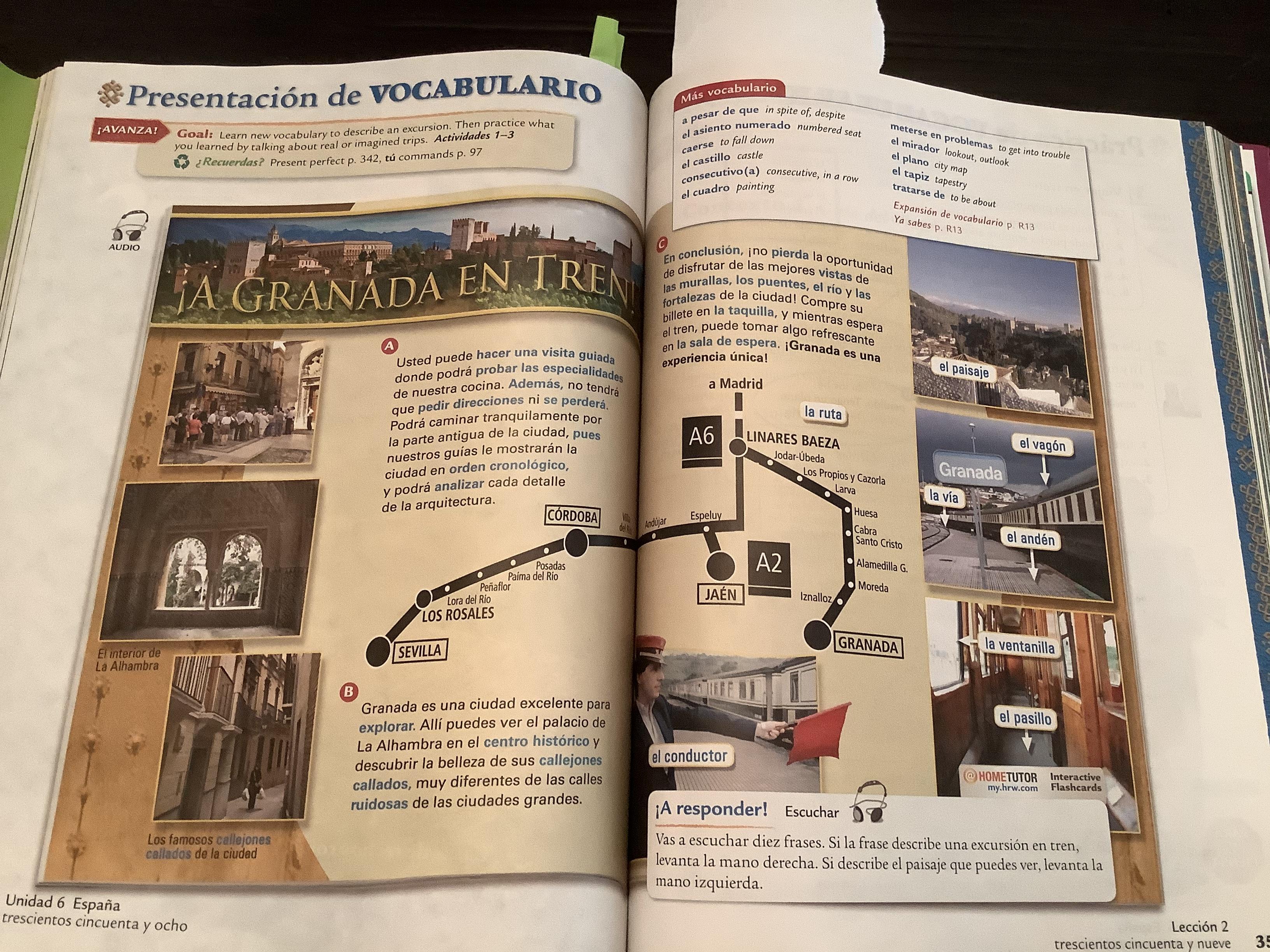 -Read “A Granada en tren!” (358-359, texto) FYI: Granada is a city in the south of Spain, part of the region called Andalucía. It’s easy to visit that region by train from Madrid. Observe in the route mal the most important cities of that region: Jaén, Córdoba, Sevilla, and Granada.